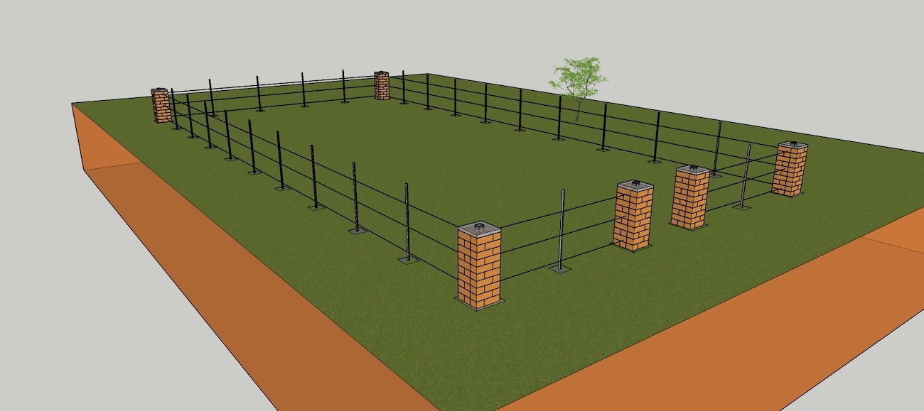 Construction de 4 poteaux en briques de terre compréssées au 4 angles du jardin et de deux poteaux à l'entrée permettant de soutenir une porte. Le reste de la clôture sera constitué de 25 piquets en fer scellés au sol avec du béton et d'un grillage de 1,5 m de haut.